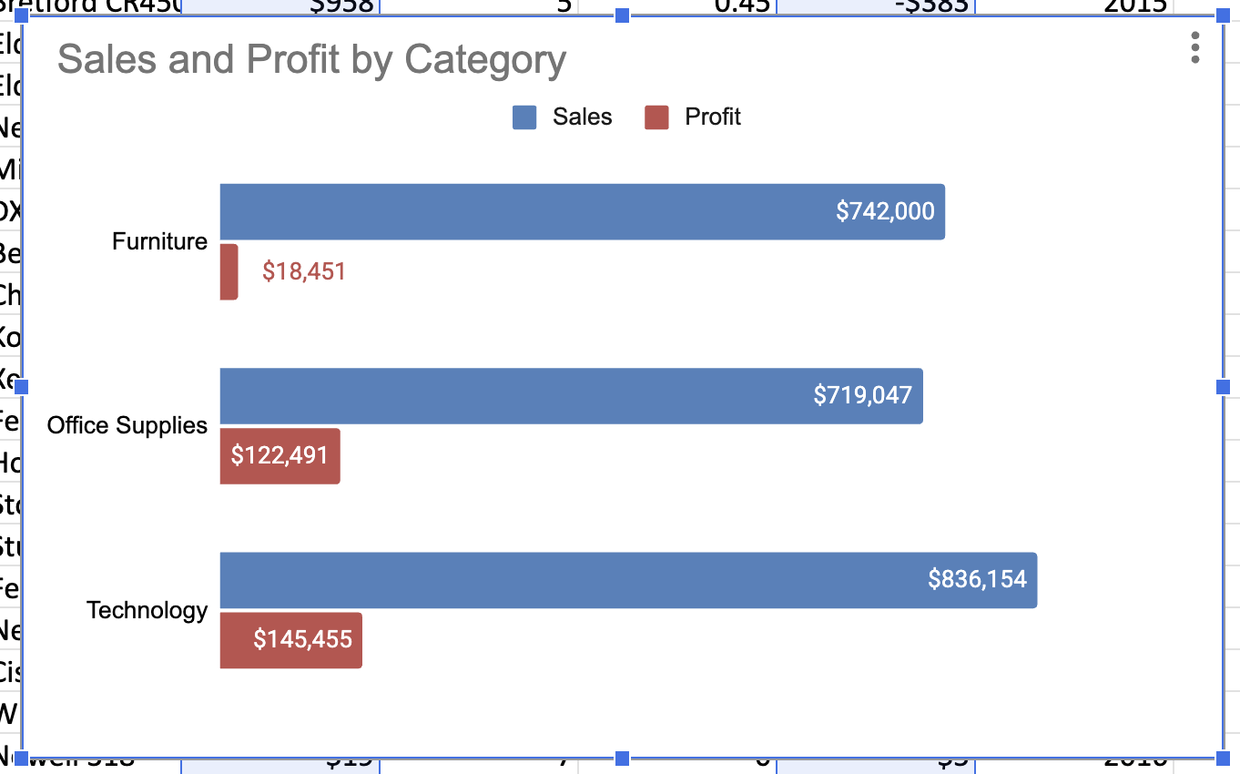 Now let’s apply the chart selection principles from the lecture. Our first question: how do Sales and Profit compare across product categories?