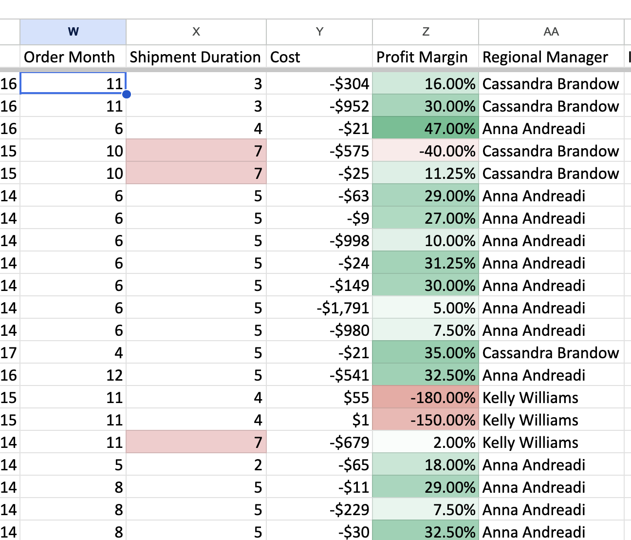 If you don’t have your Week 1 spreadsheet, make a new copy from the shared spreadsheet and re-create the derived columns from last week (Order Year, Shipment Duration, Cost, Profit Margin, Is Profitable, Regional Manager, Is Returned).