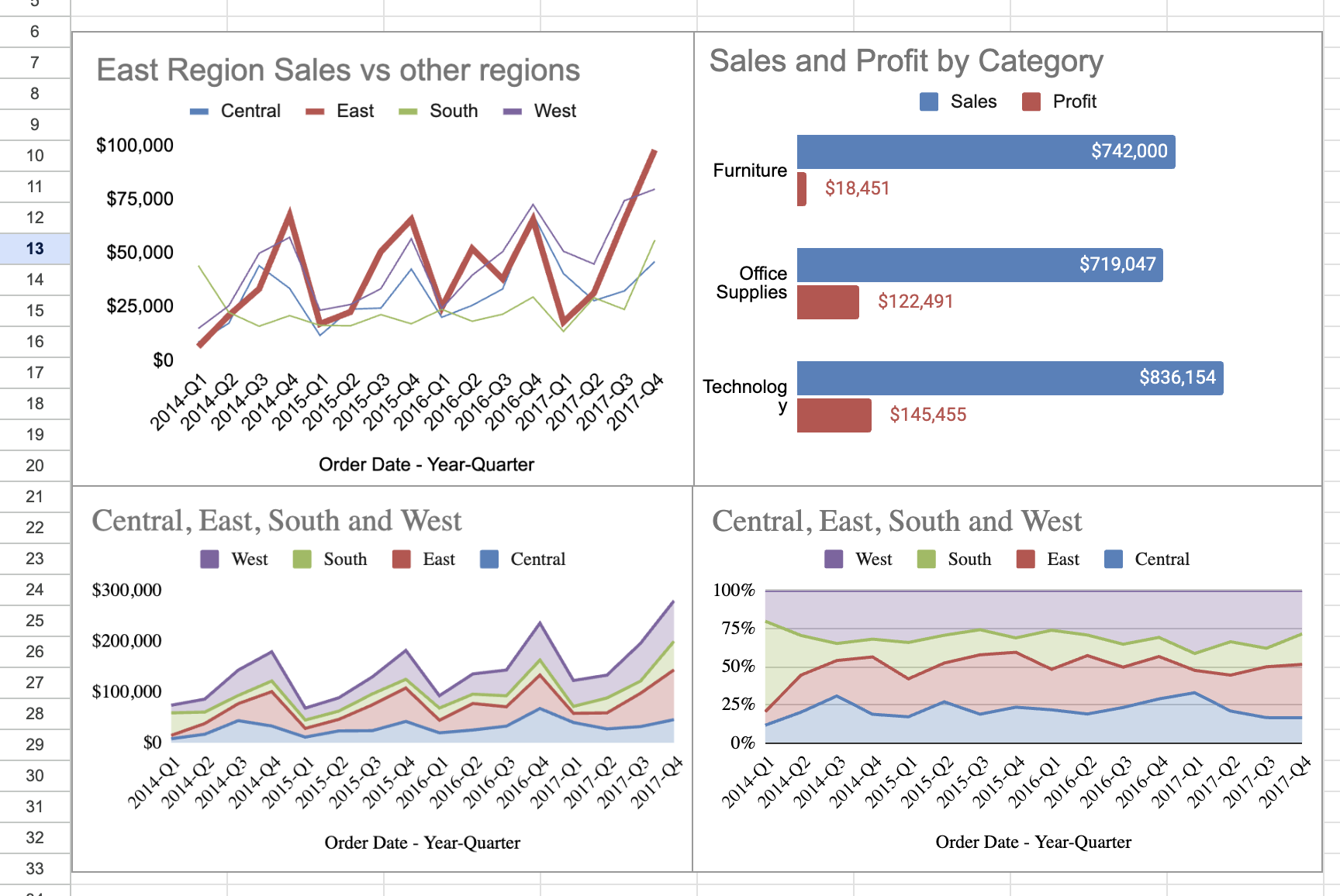 - Top-left: Line chart (East region focus)