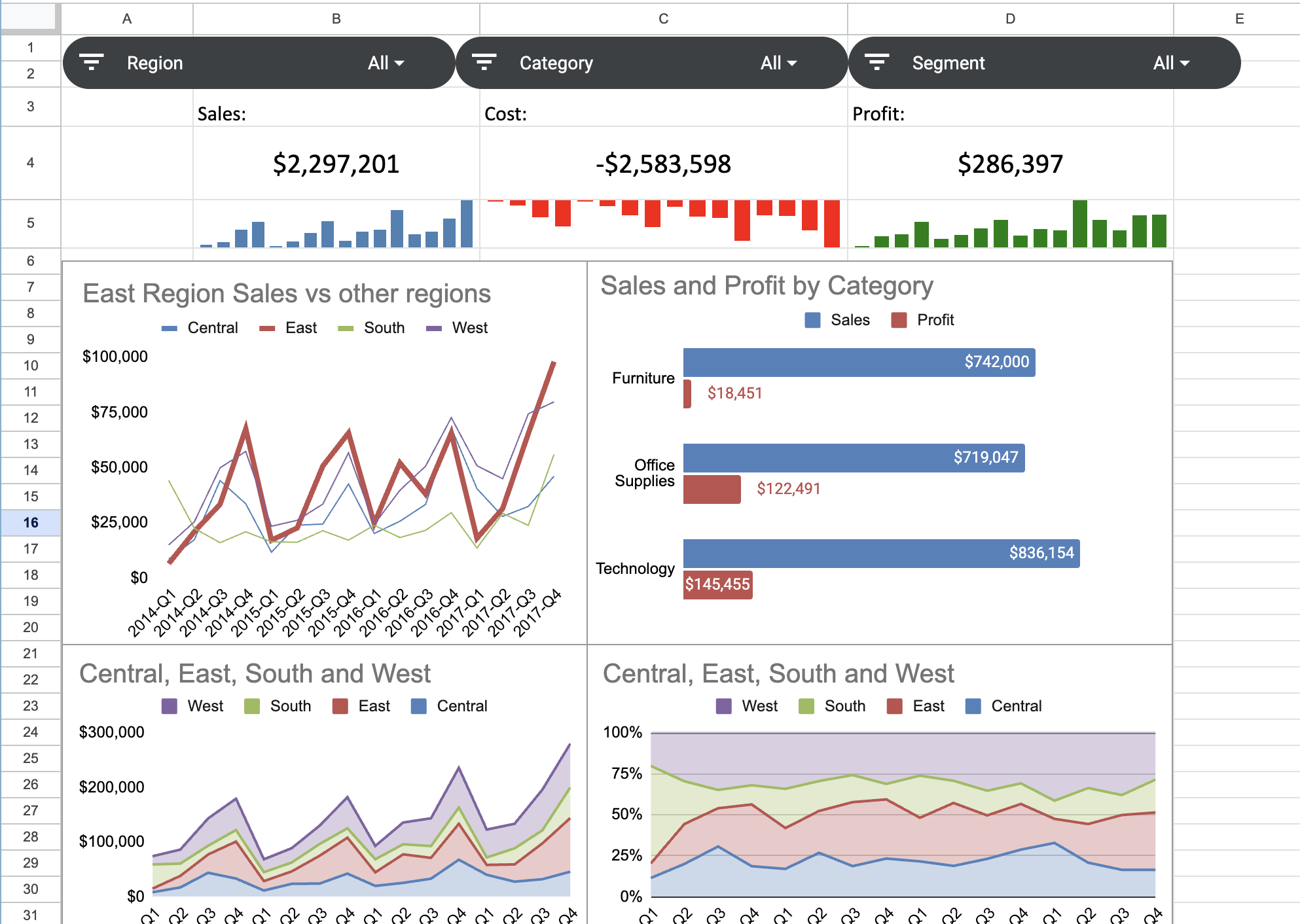 Try clicking different regions in the slicer. You’ll notice that only the bar chart reacts to the filter. The line and area charts don’t change — they’re built from pivot tables, and Google Sheets slicers don’t filter pivot table data.