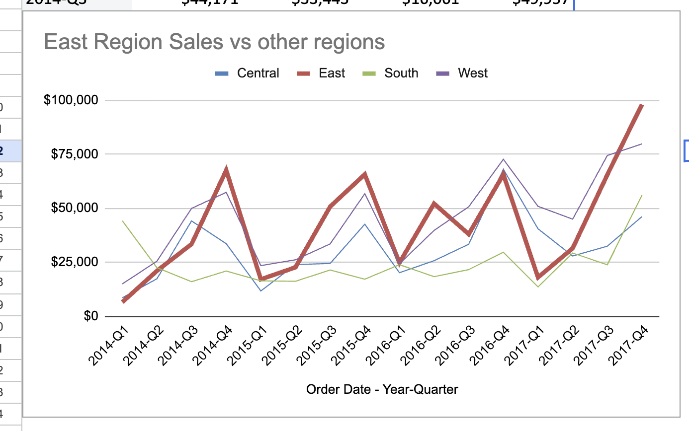 Give the chart a title like “East Region Sales vs Other Regions” and move it to its own sheet.