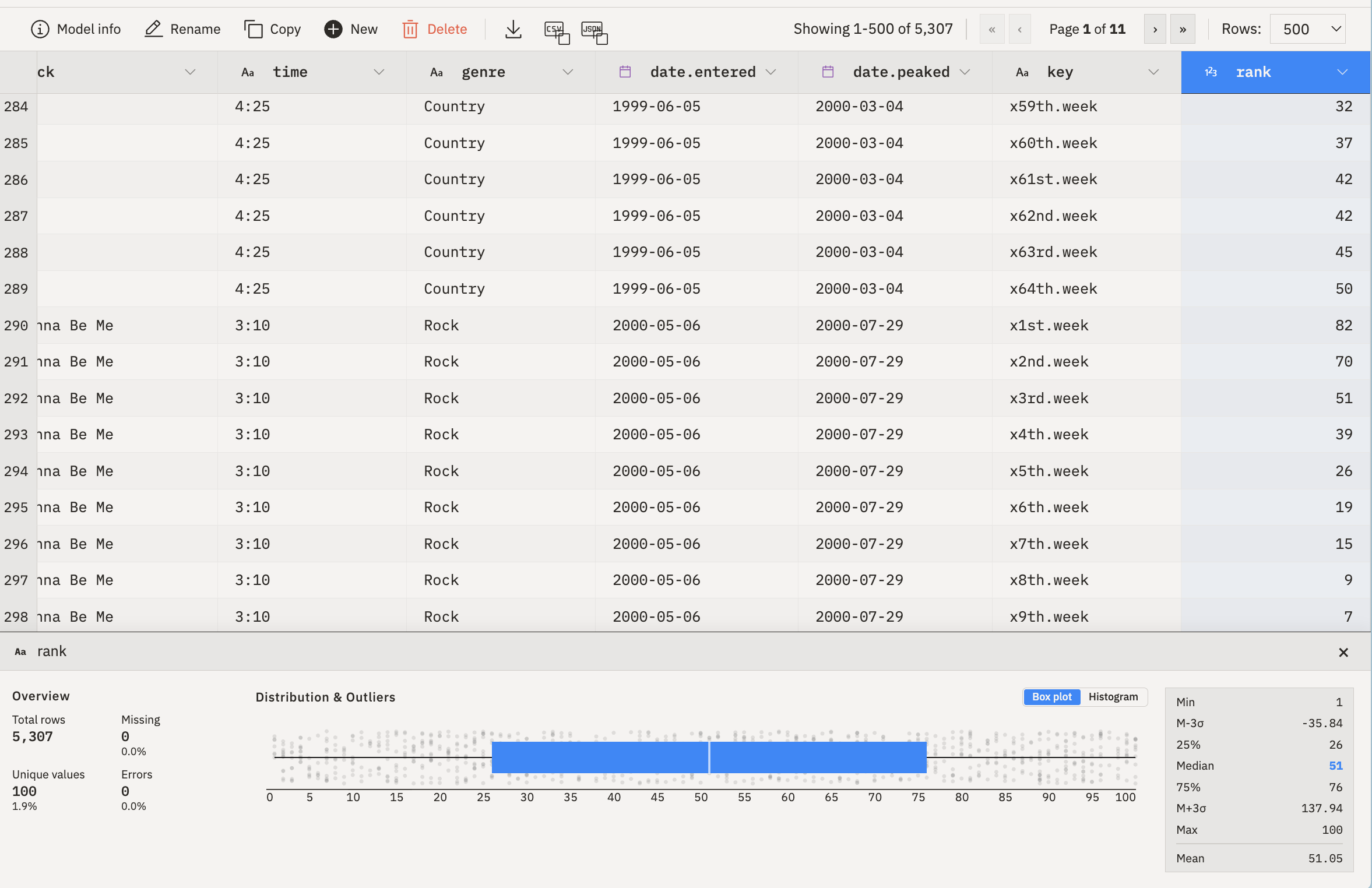 • week and rank are integers, dates are dates, no nulls in rank