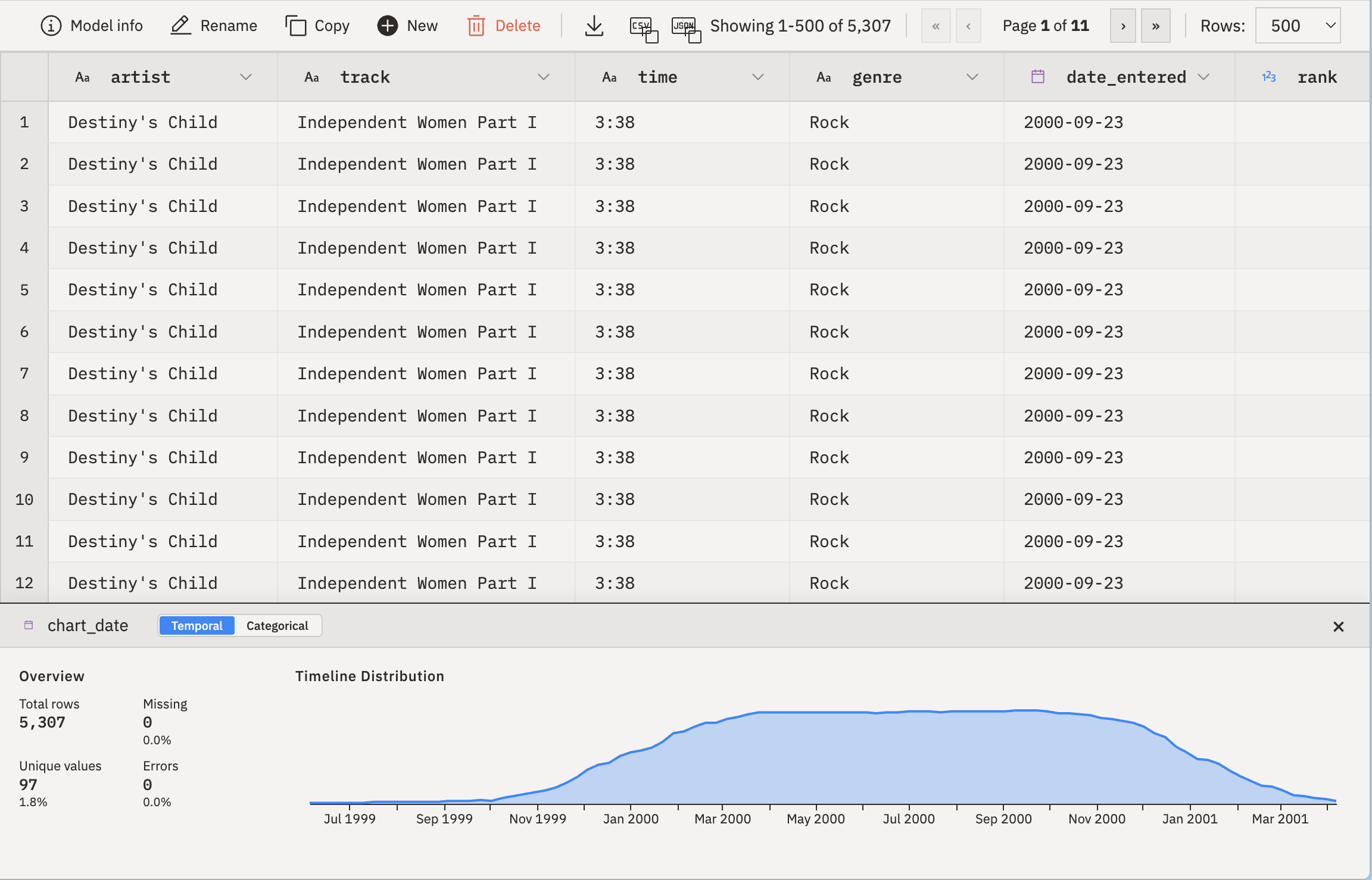 • Columns: artist, track, time, duration_seconds, genre, date_entered, week, rank, chart_date