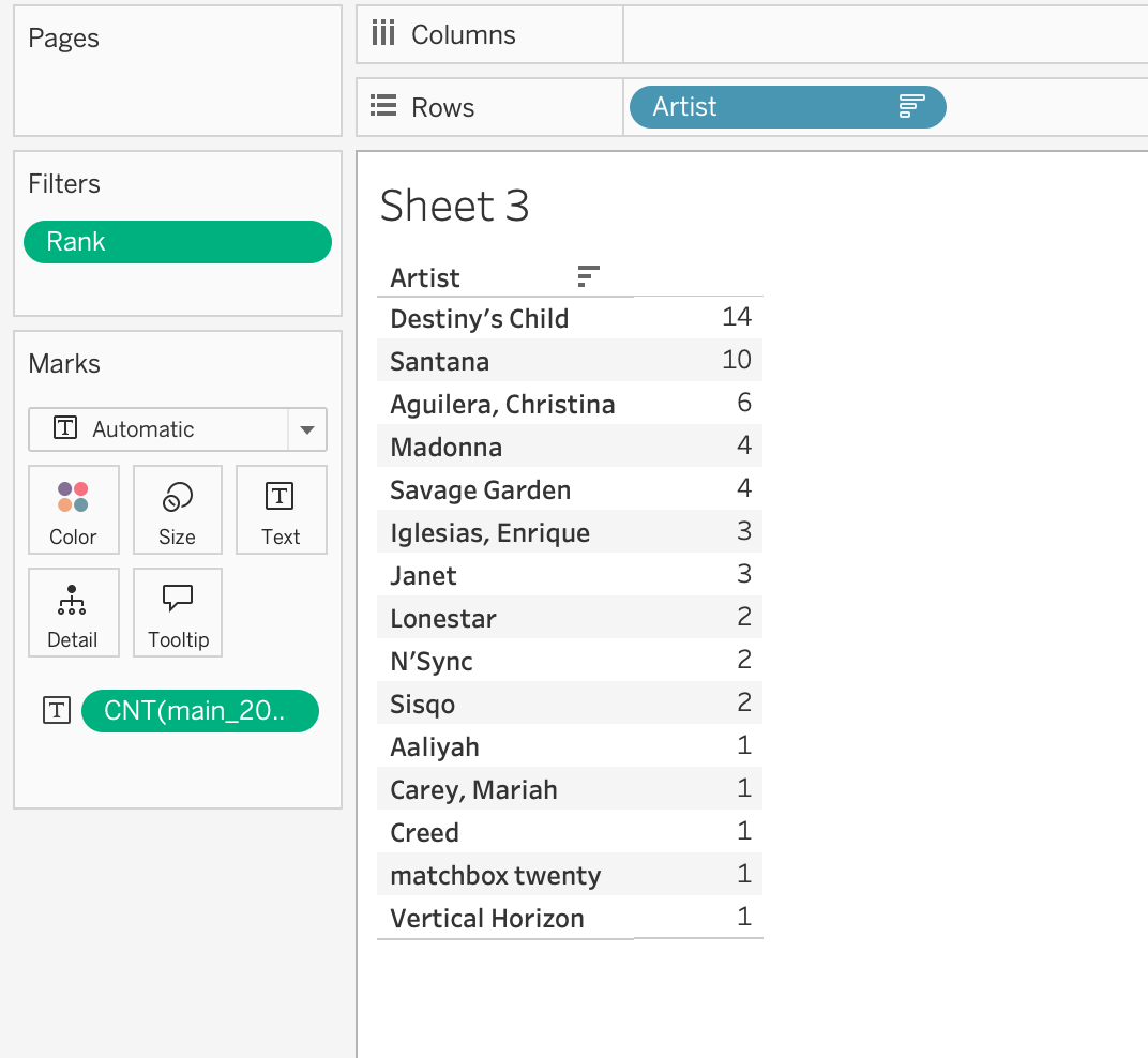 4. Drag artist to Filters > select 2-3 artists who had multiple songs (e.g., Metallica, Madonna). Show the filter as a dropdown: right-click the filter pill > Show Filter