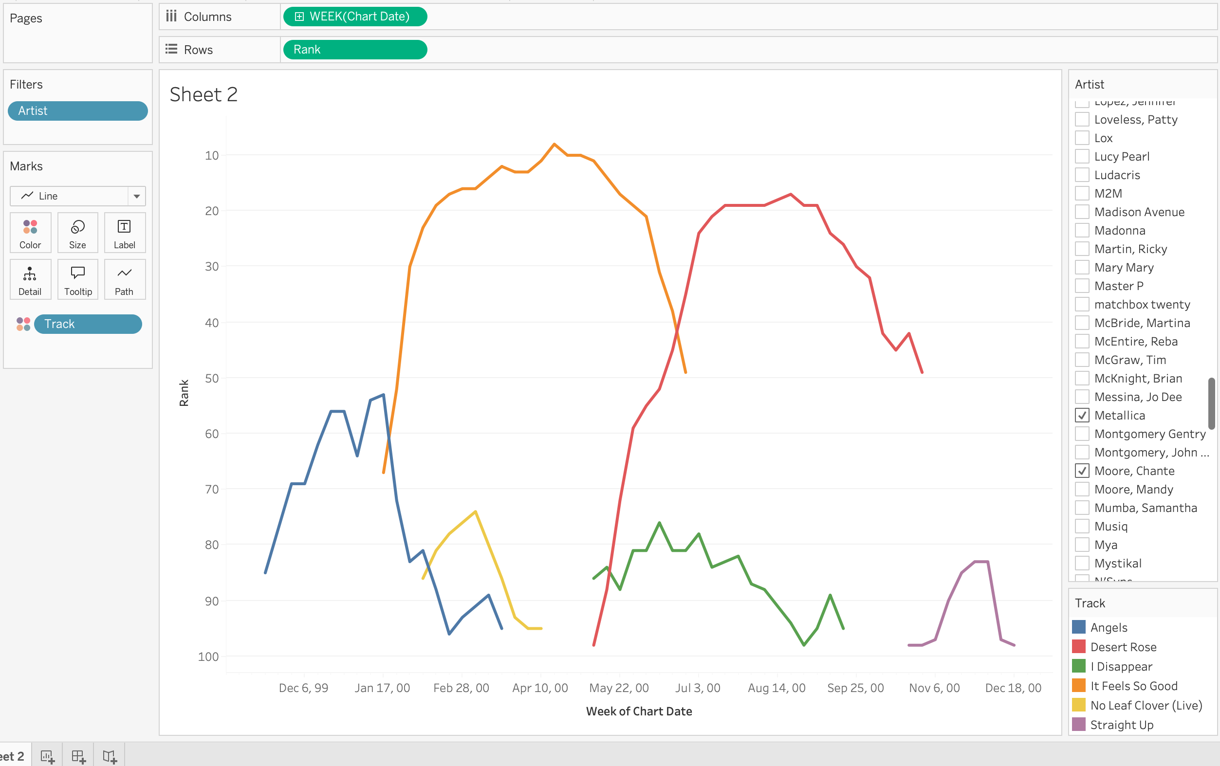 You have two datasets and a working Tableau setup. Think of a question about Billboard 2000 that interests you and try to answer it with a chart. Some starting points: