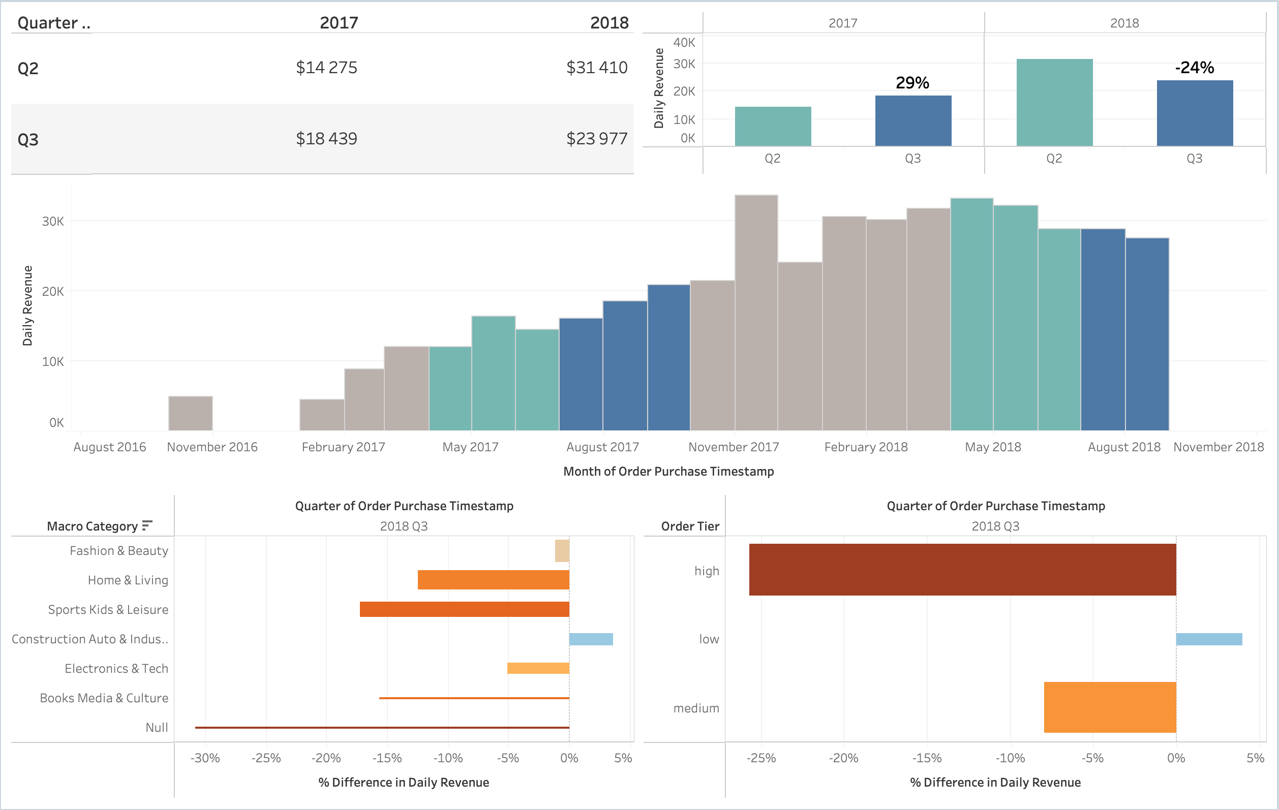 Grouped bar chart. Next to the scorecard, build a bar chart with the same data — Quarter on the X axis, grouped by Year, Daily Revenue on Y. Add the percent difference as a label on the Q3 bars so the contrast is visible at a glance (+29% in 2017, -24% in 2018).