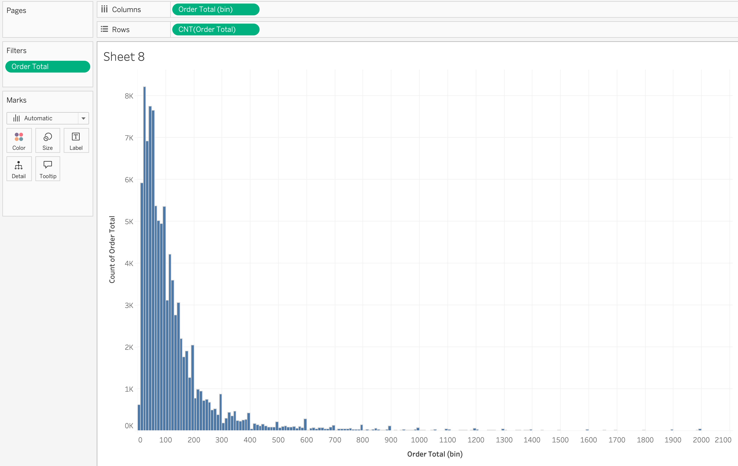 Explore the distribution. Build a histogram of Order Total — you will notice extreme outliers stretching the axis. Filter those out (e.g., exclude values above a reasonable threshold) so you can see where the bulk of orders fall. The ideal bin size is something you should figure out by experimenting — try different values until the shape of the distribution is clear.